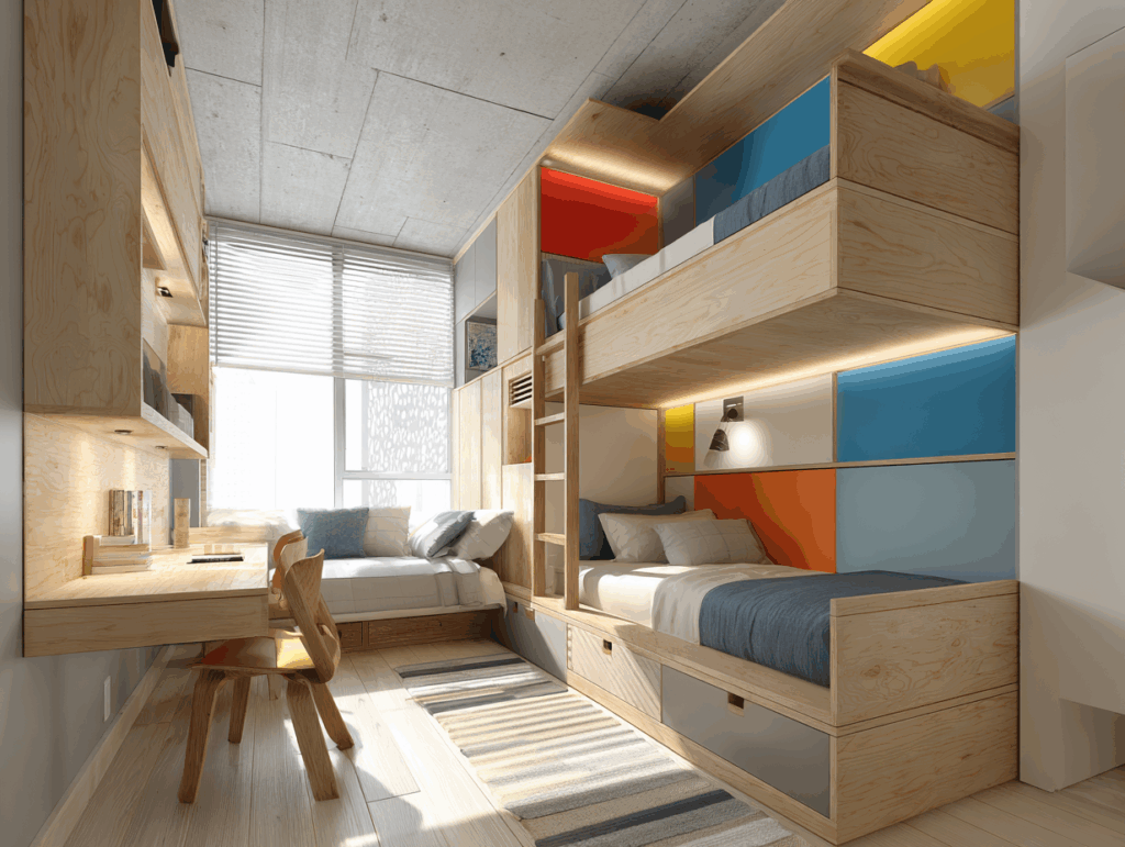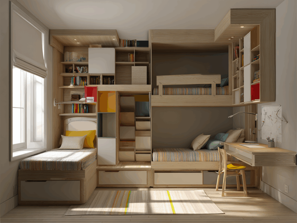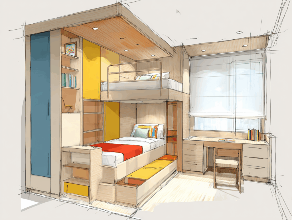 La solution : Lit superposé sur mesure avec bureau intégré sous le lit du bas (escamotable), rangements tiroirs sous chaque lit, échelle en bois massif fixe, garde-corps de sécurité. Dressing de 2,40 m avec intérieur modulable (crochets à hauteur enfant, étagères réglables). Structure prévue pour être reconvertie en deux lits séparés et bureau indépendant à l’adolescence.