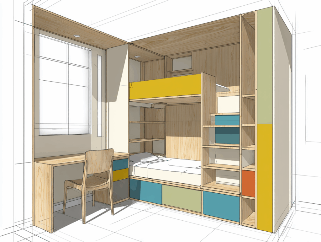 Une chambre d’enfant sur mesure est un investissement sur 15 à 20 ans. Nous concevons des espaces qui évoluent avec l’enfant : lit superposé avec bureau intégré pour la période scolaire, rangements modulables qui s’adaptent aux âges successifs, bureau qui grandit avec l’enfant, dressing qui passe de l’organisation jouets à la garde-robe adulte. Un seul investissement pour toute l’enfance et l’adolescence.