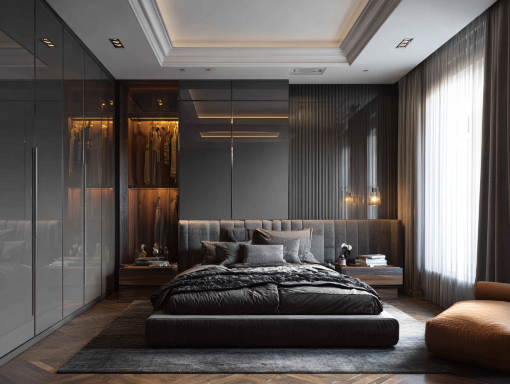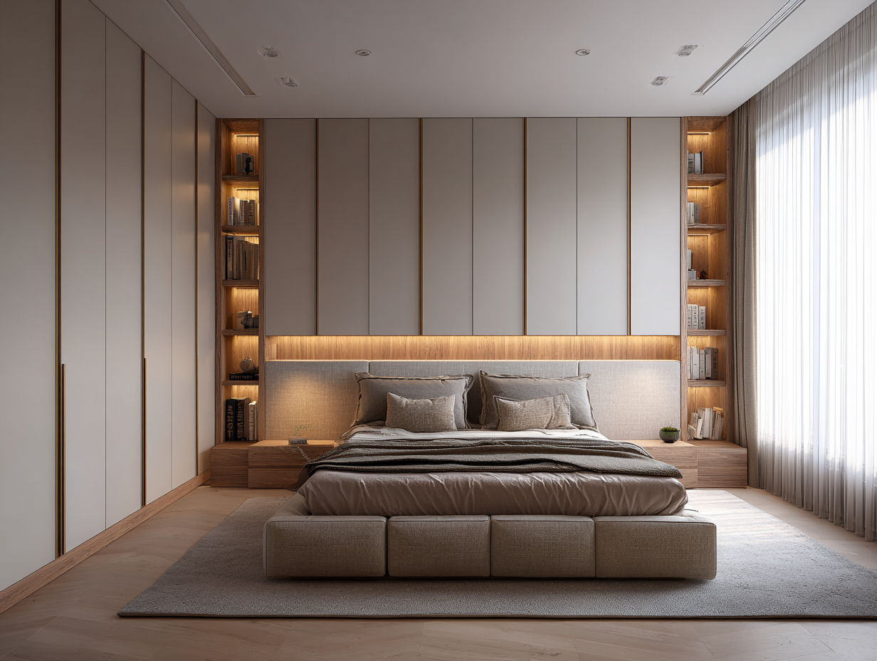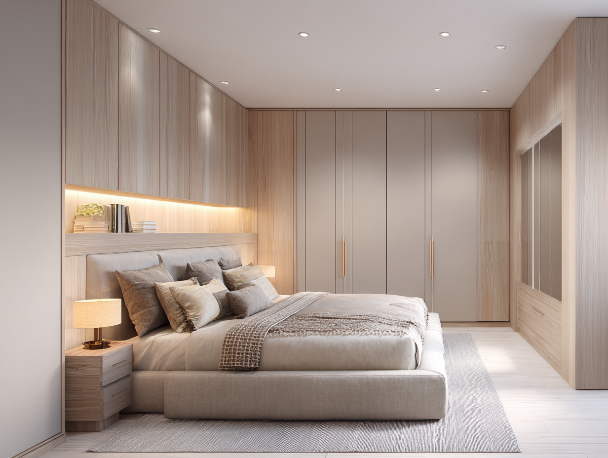 Pour les chambres où l’on préfère cacher entièrement le rangement, l’armoire encastrée avec portes affleurantes au mur est la solution idéale. Les portes sont réalisées dans le même matériau que les murs ou avec une finition miroir qui agrandit visuellement l’espace. Le résultat : une chambre épurée où aucune armoire ne se distingue, tout en disposant d’un rangement considérable derrière les portes.