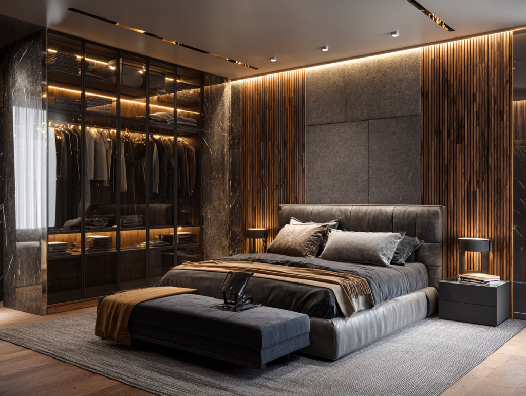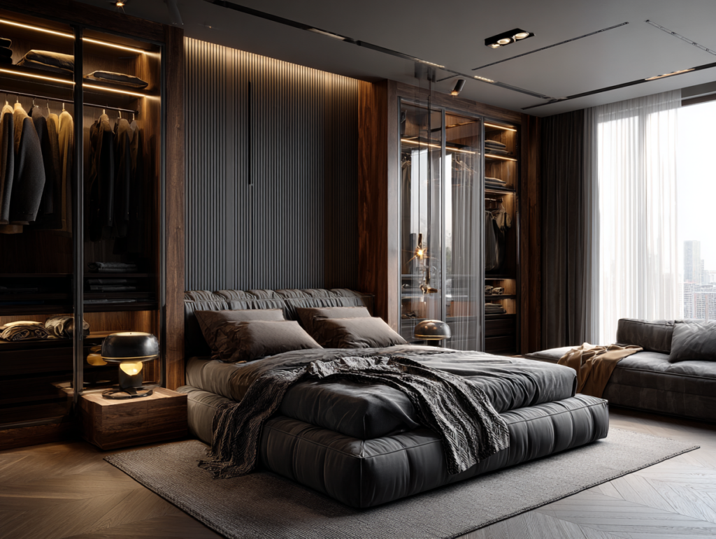 La chambre doit rester un espace de repos. Privilégiez les rangements fermés pour tout ce qui n’a pas de valeur décorative. Limitez les surfaces ouvertes aux objets qui vous font plaisir à voir. Un dressing entièrement fermé derrière des portes épurées contribue considérablement à la sensation de calme et d’ordre qui favorise un bon sommeil.