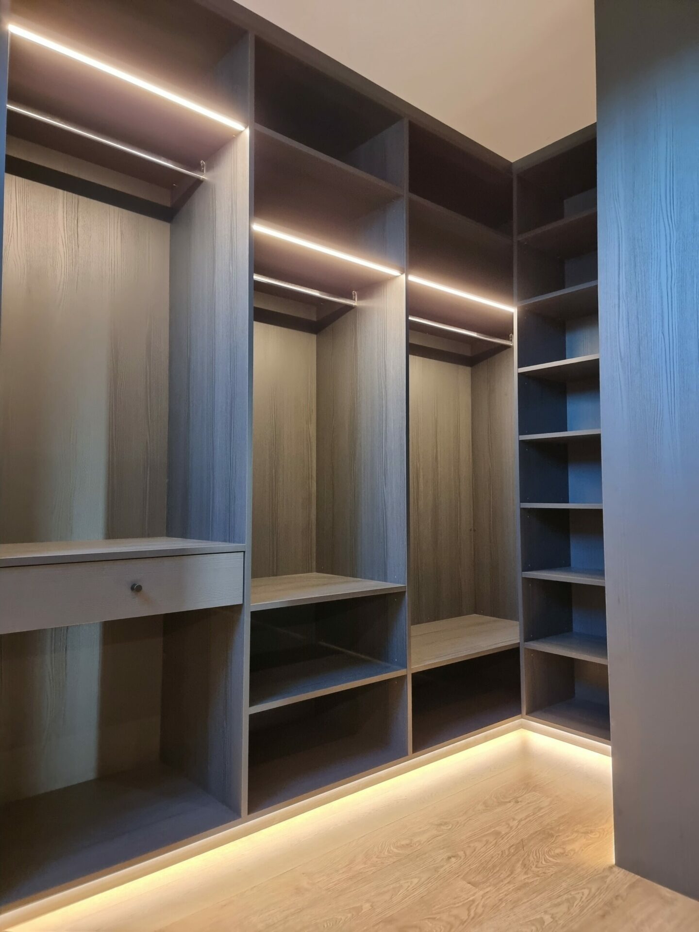 Un dressing sur mesure, c’est l’alliance du savoir-faire artisanal et de votre vision personnelle. Chaque centimètre compte, chaque détail est pensé pour optimiser votre quotidien. Contrairement aux solutions standardisées, notre approche vous garantit un mobilier unique, durable et parfaitement intégré à votre espace.