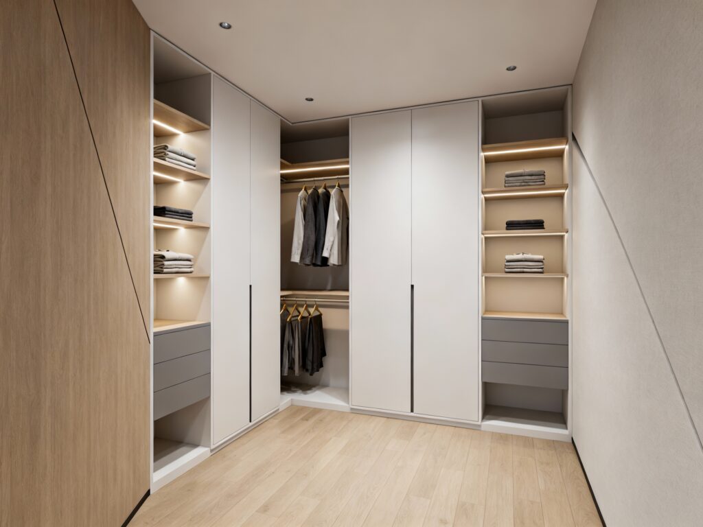 Nouvelle construction ou rénovation : Intégrer le dressing dès la conception permet d’optimiser l’espace et de prévoir les branchements électriques (LED, prise USB).
